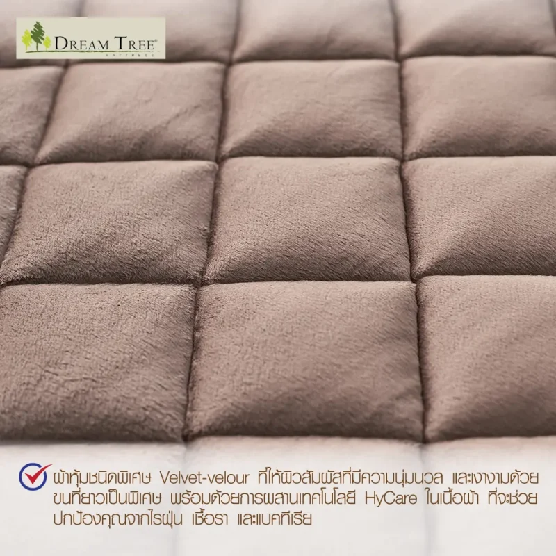 ผ้าหุ้มชนิดพิเศษ Velvet-velour ที่ให้ผิวสัมผัสที่มีความนุ่มนวล และเงางามด้วยขนที่ยาวเป็นพิเศษให้คุณได้รู้สึกเหมือนการนอนบนปุยเมฆ พร้อมด้วยการผสานเทคโนโลยี HyCare ในเนื้อผ้า ที่จะช่วยปกป้องคุณจากไรฝุ่น เชื้อรา และแบคทีเรียได้อีกด้วย